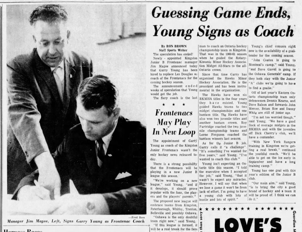 In the early 1960’s Garry founded the ‘Hawks’ organization in the competitive Kingston Rotary-Kiwanis Minor Hockey Association, and they iced strong teams each year. In the 1963-64 season the Hawks swept all three RKMHA titles, winning the Bantam, Midget and Juvenile championships, with Garry coaching the Bantam and Midget teams. He was also the curator at Kingston’s new International Hockey Hall of Fame on York Street, working to promote the museum and that included having his kids hand out flyers to cars coming into town from Highway 401.