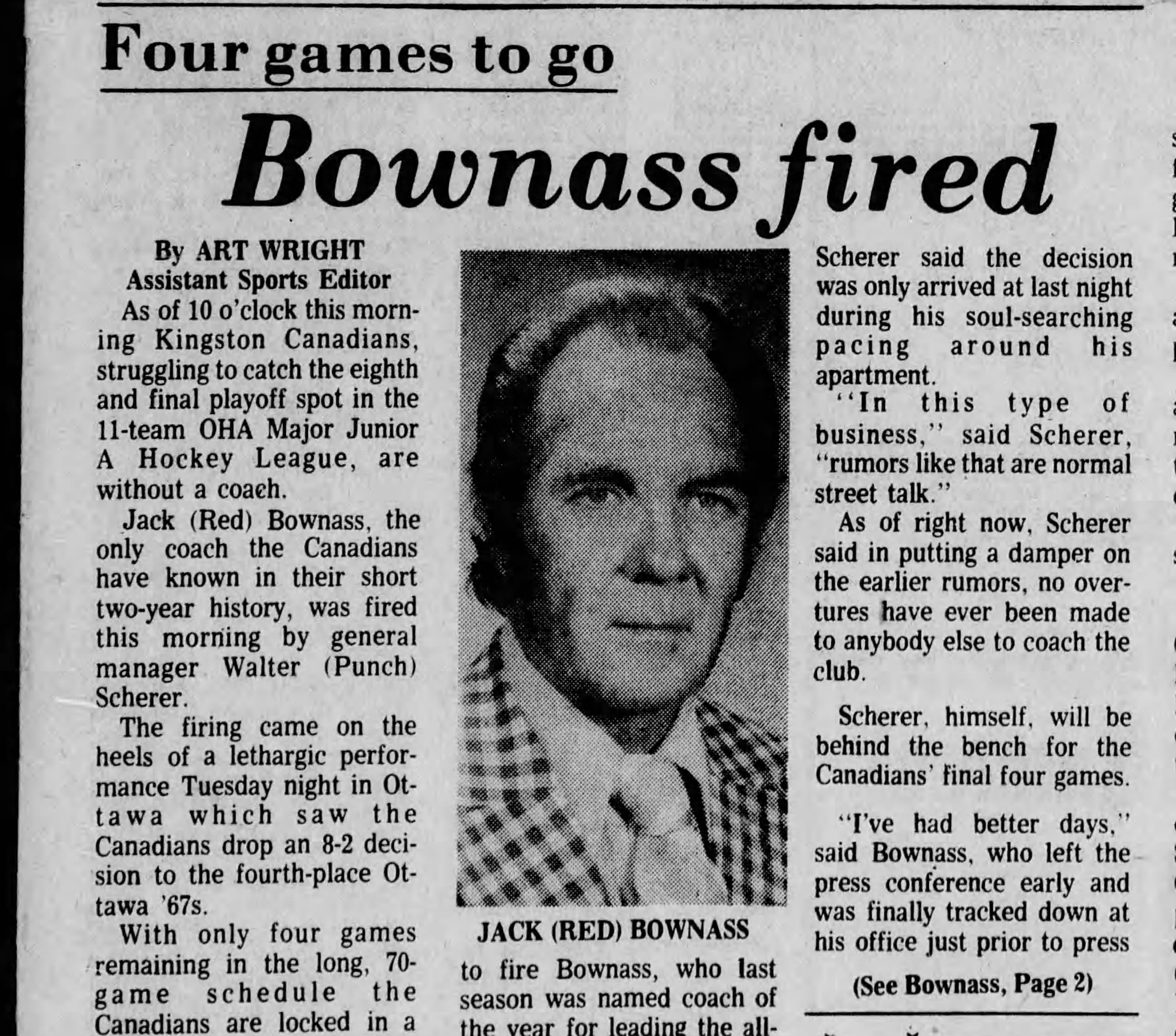 Kingston fired its coach, dapper Jack (Red) Bownass with just four games left in the regular season. A gutsy call that saw General Manager Walter (Punch) Scherer take over. Punch had coached earlier in his career including with the famed Kitchener-Waterloo Flying Dutchmen senior team, but it had been many years.
