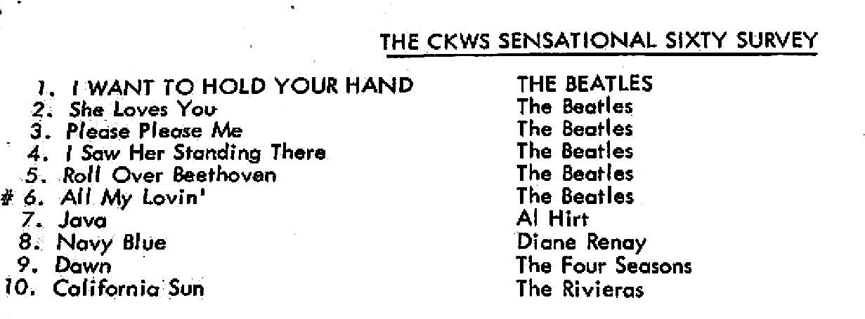 The Beatles popularity exploded in February,1964 when 73-million people tuned in to watch the band perform five hits on The Ed Sullivan show. Just one month later, the CKWS ‘ Sensational 60’ hit parade chart featured the top six songs all by the Fab Four – the most requested and best-selling singles in Kingston.