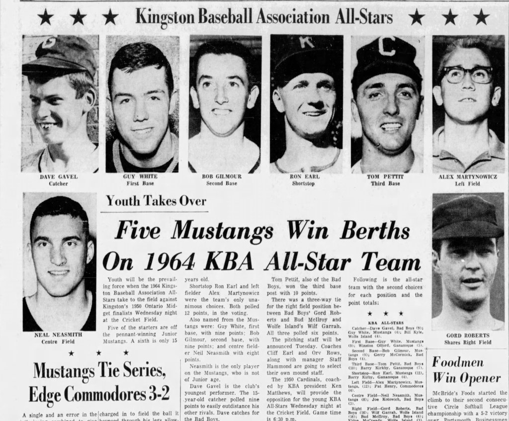 The Mustangs top players became the core of the 1967 Kingston Lakeview Indians championship team. The Indians ended a 32-year drought for Kingston baseball by winning a second OBA Sr. A title. Coached by two Kingston legends, Hall of Famers Bob Elliott Sr. and Cliff Earl.