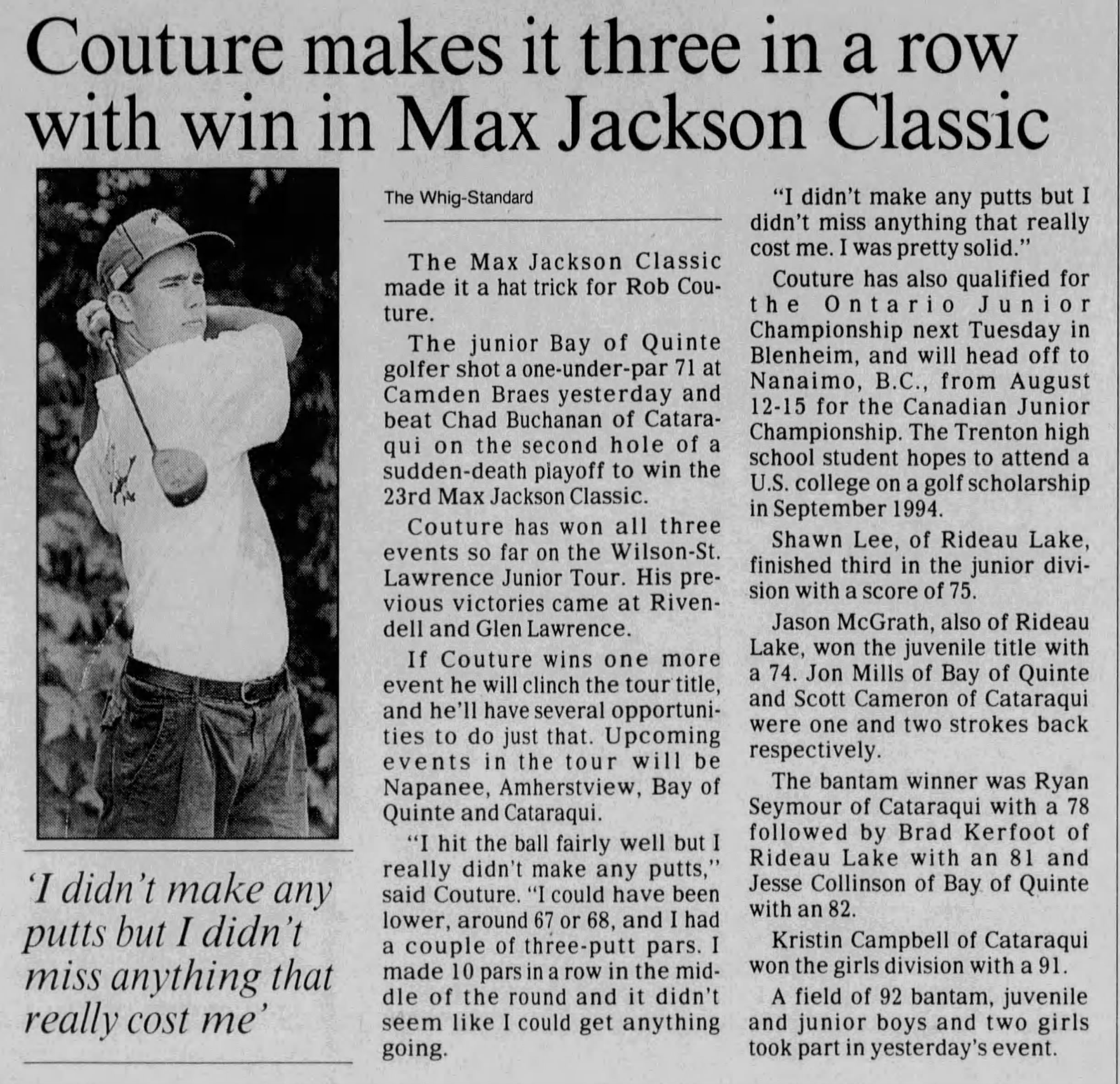 The final year for the tournament was in 1993 at Camden Braes. Bay of Quinte’s Rob Couture shot a 71 and beat Cataraqui’s Chad Buchanan on the second playoff hole for the win. It was Couture’s third victory of the season on the St. Lawrence Junior Golf Tour and the Trenton, ON high school student qualified for the Ontario Junior Golf Championship.