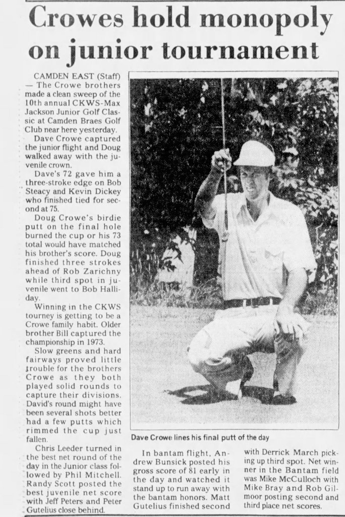 Older brother Bill Crowe won the Max Jackson Junior Classic in 1973. As a sixteen-year old he fired a 69 at Glen Lawrence. Bill’s caddy that day was Rick Hession, who was also his boss – owner of the local McDonald’s Restaurant where Crowe worked.