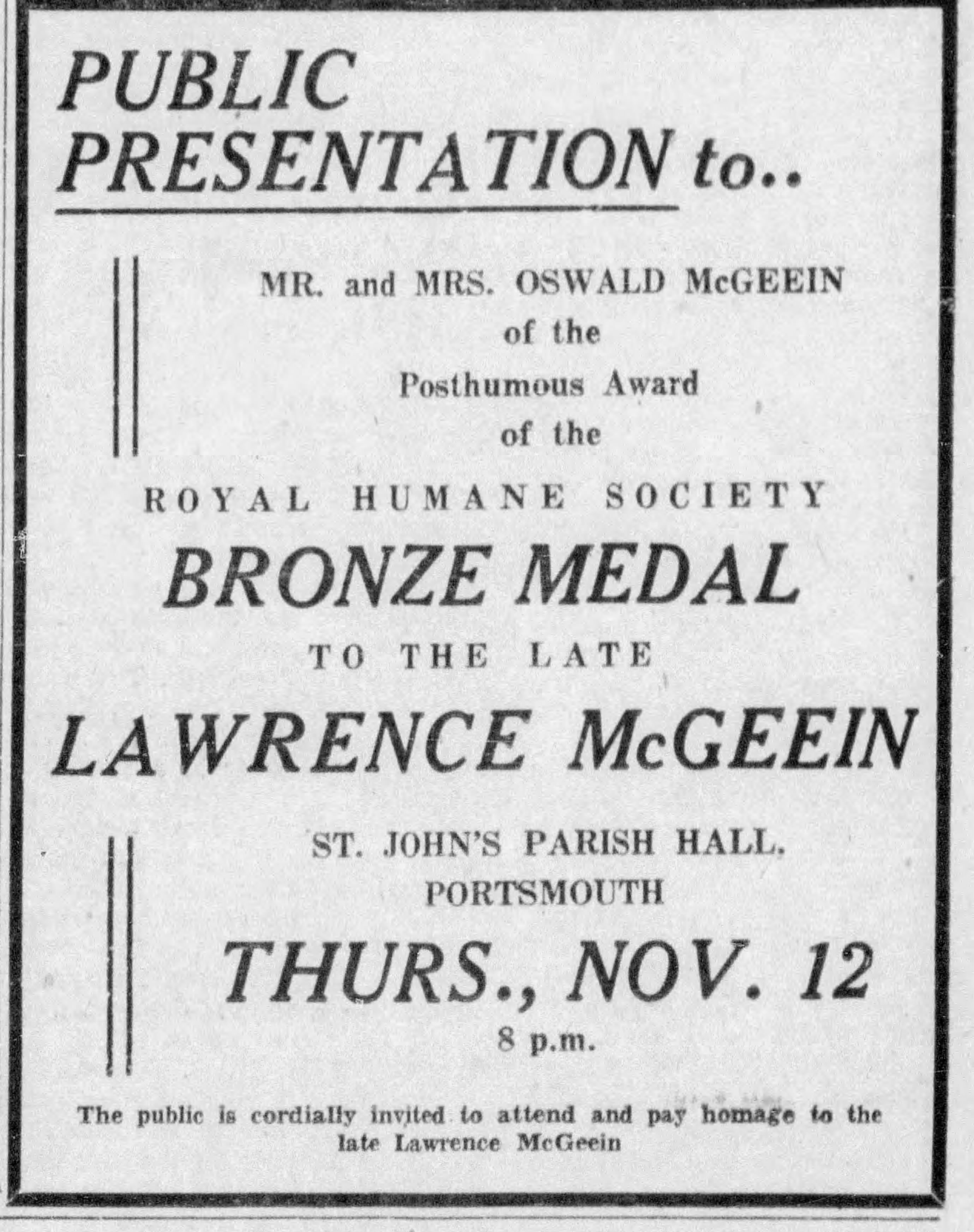 Lawrence McGeein was the only civilian on the Portsmouth Honour Roll in recognition of his bravery and sacrifice.