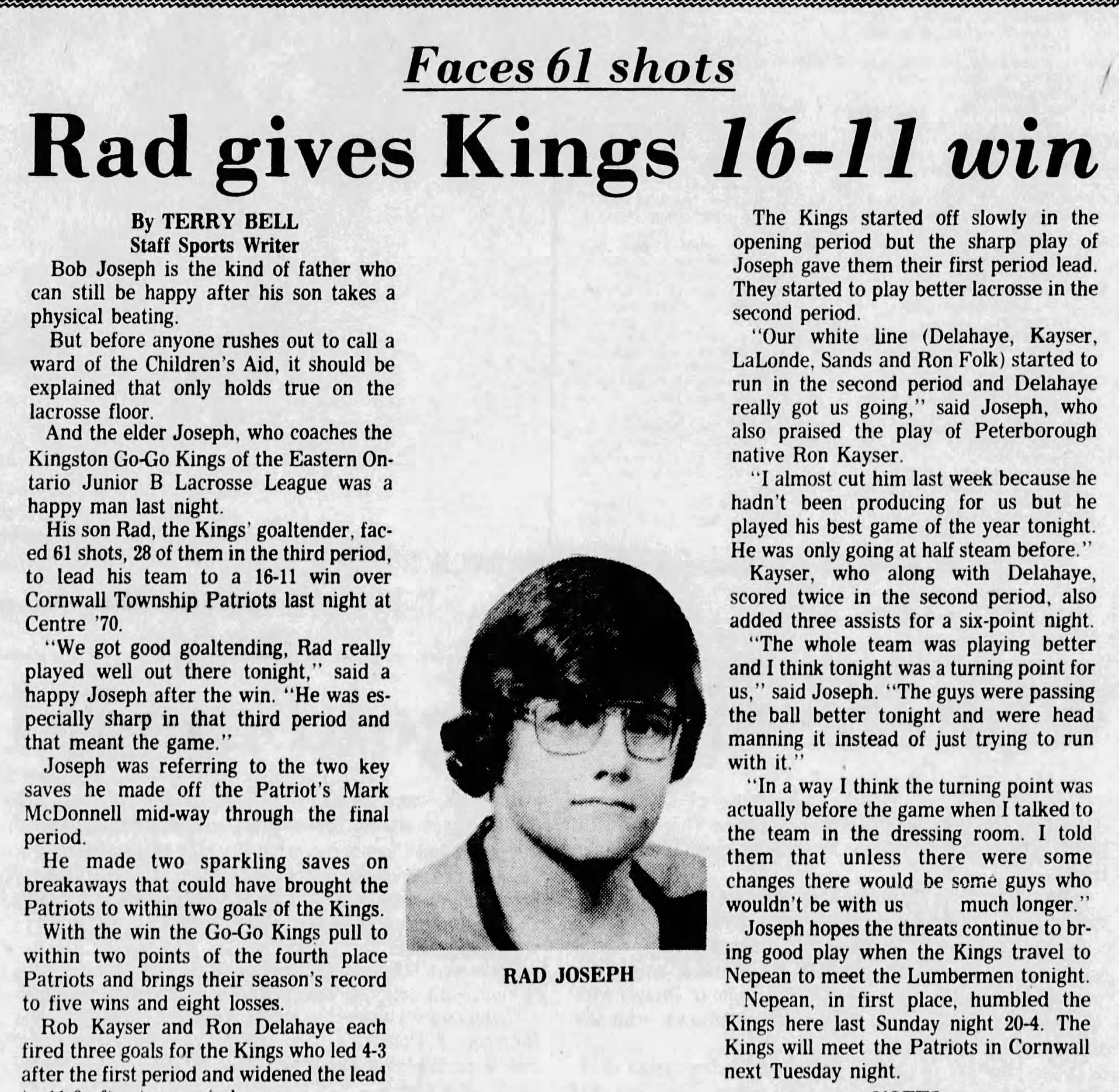 His son, Rad Joseph, a former goalie for the Kingston Go Go (Pizza) Kings junior team, has blazed his own trail in lacrosse – making a major contribution to the sport over the decades.