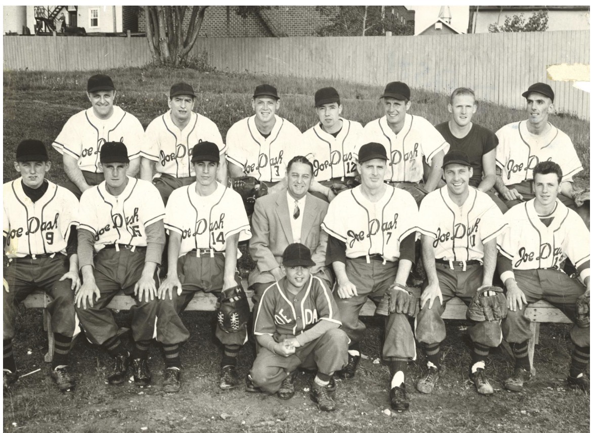 A vintage baseball team photo featuring players in ‘Joe Dash’ uniforms, showcasing the camaraderie and community spirit in Kirkland Lake during the 1950’s. Don Blackburn – front row, far left.