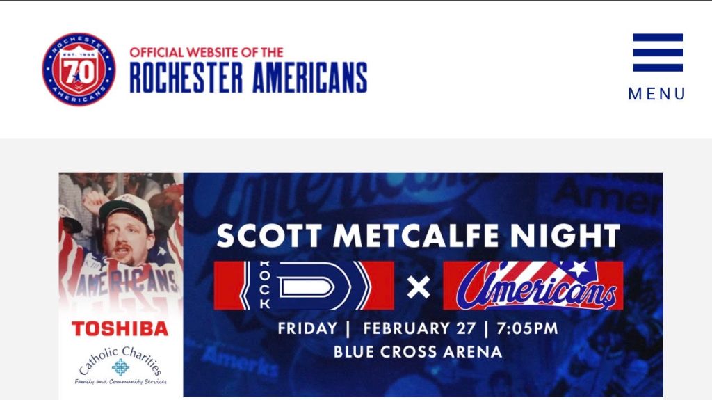 The AHL’s Rochester Americans will honour the memory of Scott Metcalfe when they host the Laval Rocket Friday night Feb 27th. Metcalfe, who died suddenly in June, 2025 at age 58, spent 9 years of his 14-year pro career in Rochester and retired there, a favourite of both Amerk fans and his teammates.