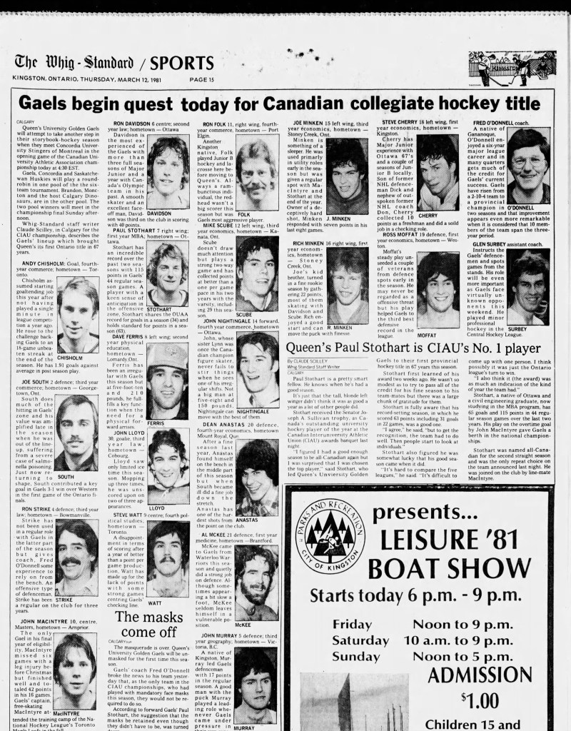 Other key players on that ’81 Queen’s team included John MacIntyre and Ron Davidson. Stothart and MacIntyre were named All-Canadians. Kingston’s Steve Cherry was a freshman on the Gaels, and Ron Folk, who had played Jr B hockey and lacrosse in Kingston, also played for Queen’s.